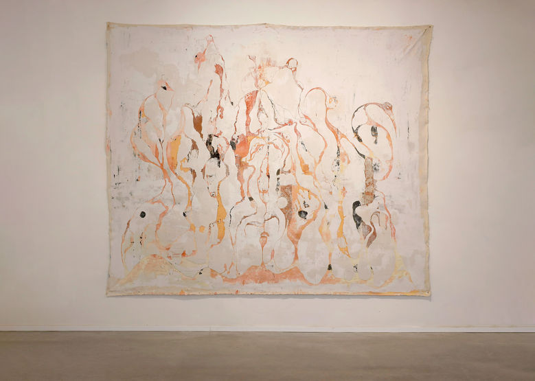 Katrin uses the traditional sgraffito technique – applying layers of plaster and paint and scratching the top layer while it's still wet – to expose contrasting layers of material and color. Tolkovsky paints and plasters the painting recursively. The painting emerges from within the wall, revealing a layer teeming with fractured vitality that transforms into a source of beauty and solace. The canvas – raw and crucified – is nailed to the wall like an organic skin, almost human. It unravels and crumbles, shedding its layers to reveal traces of life that evolve with time. Past and present interweave to form delicate scars of grace and rejuvenation.
